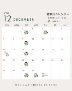 いつも穴口ふとん店をご利用いただき誠にありがとうございます。 2025年12月は、毎週火曜日の定休日のほか、4日(木)に臨時のお休みをいただきます。 なお年内は29日(月)まで通常通り営業します。 また14日(日)には特 […]