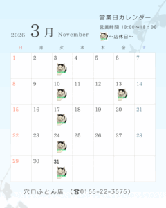 いつも穴口ふとん店をご利用いただき誠にありがとうございます。 2026年3月は、毎週火曜日の定休日のほか、13日(金)に臨時のお休みをいただきます。 その他は通常通りの営業です。 もうすぐ春です 新生活に向けて寝具をお探 […]
